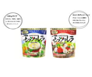 モッツァレラチーズの形を崩さないためとフレッシュさを守るよう、スタンディングパウチ(袋状の容器)で、密閉性を高める細やかな工夫を行っております。